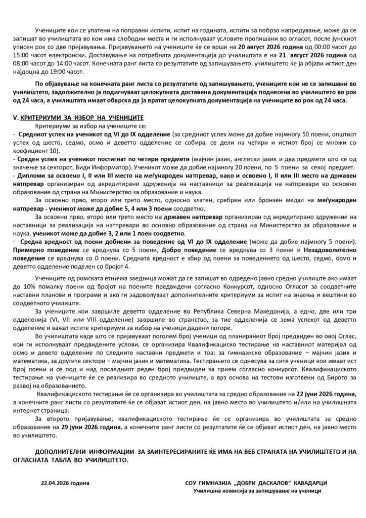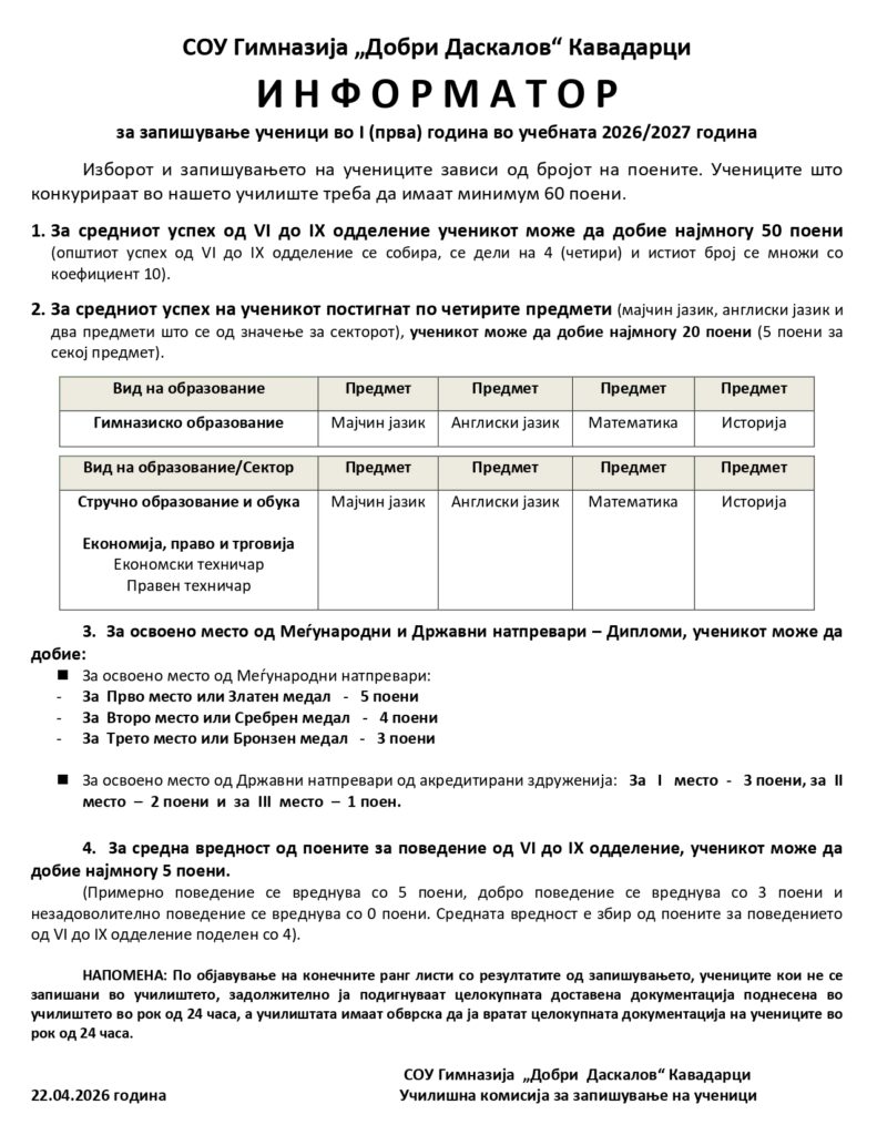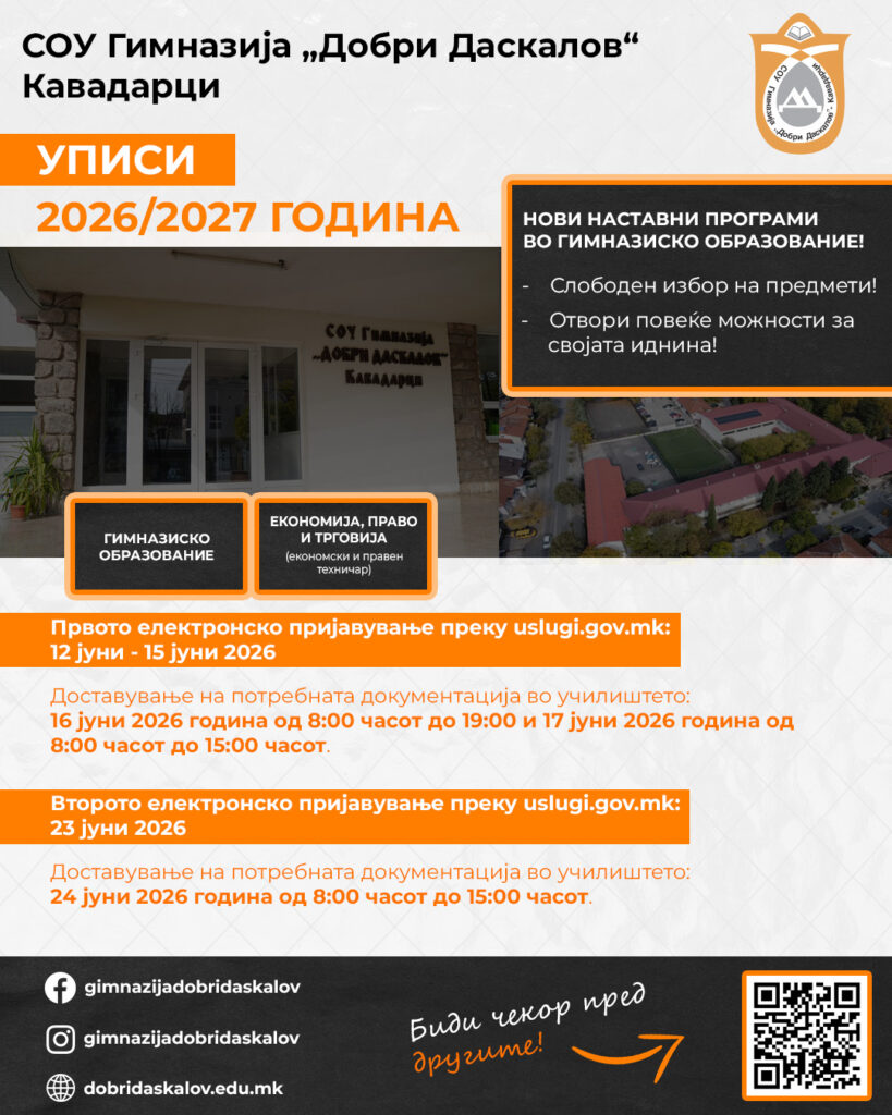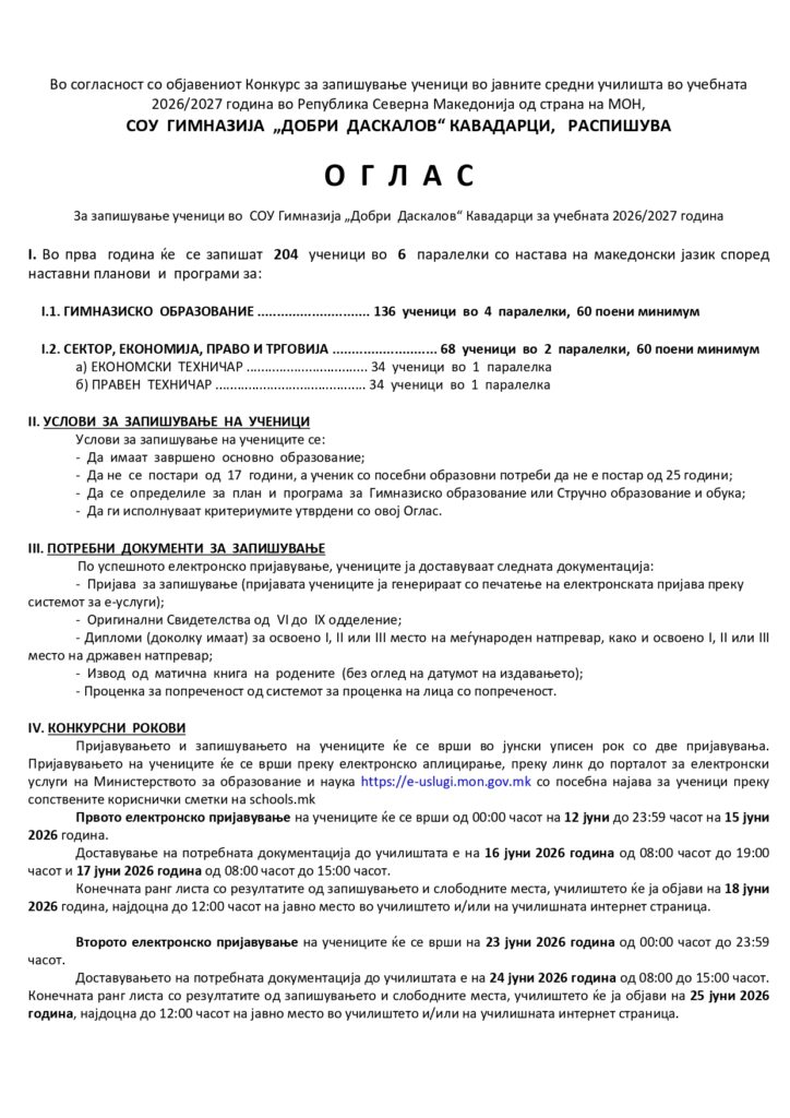 ОГЛАС и ИНФОРМАТОР за уписи во I година во СОУ Гимназија „Добри Даскалов“ Кавадарци
